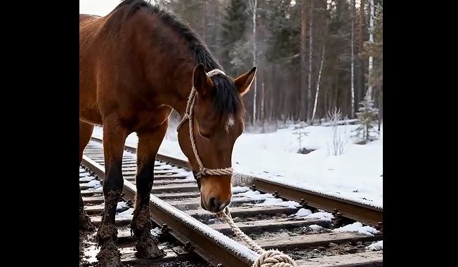 The scene opens on a desolate, snow-covered railway track surrounded by a quiet forest. A beautiful brown horse stands trapped and alone, its lead rope tied securely to the cold steel rail. Its whinnies echo through the trees, a chilling sound of fear as it pulls against its restraints, its breath pluming in the frigid air.