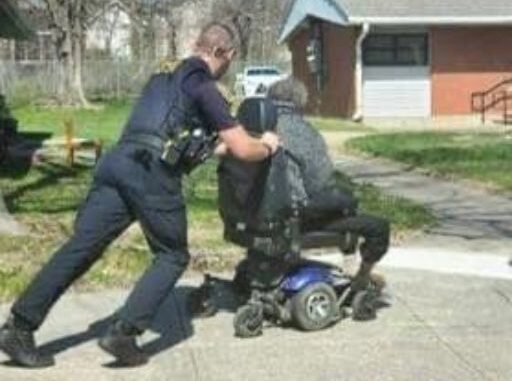 The officer looked around—no way to charge it, no easy fix. So, without hesitation, he placed both hands on the wheelchair and started pushing.