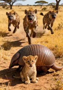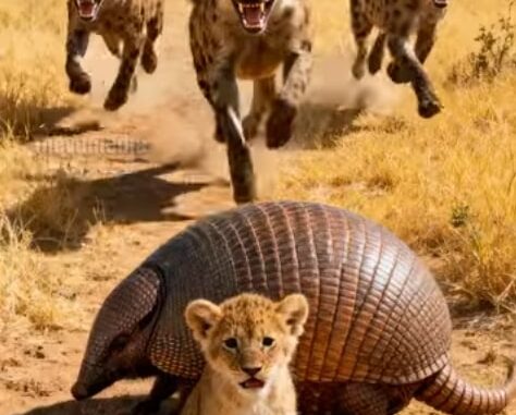 From a patch of scrub, an armadillo hustled forward, scales catching the sun, tail flicking like a whip. It didn’t hesitate. As the hyenas closed in, the little tank tucked tight and planted itself over the cub like a bronze helmet. The first hyena skidded in surprise, teeth flashing as it tested the armor. The second nudged and bit. The third circled for an opening. Inside that living shield, the cub squeaked and pressed its face to the ground, safe beneath a shell that refused to break.