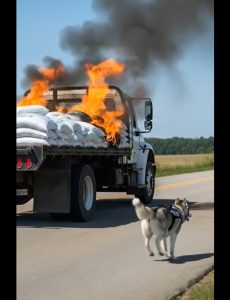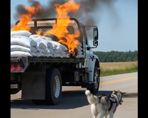 A large truck sped down the road — its cargo already burning and spreading fast.