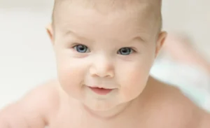 The infant, our kid, had skin as pale as fresh snow, wisps of blonde hair, and shockingly blue eyes.