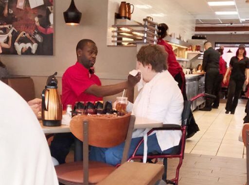 Mr. Nolan loves his wife in a way that’s quiet but powerful. She’s in a wheelchair, her hands too unsteady to feed herself. And every time they come in, he feeds her, bite by bite, while his own meal goes cold.