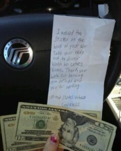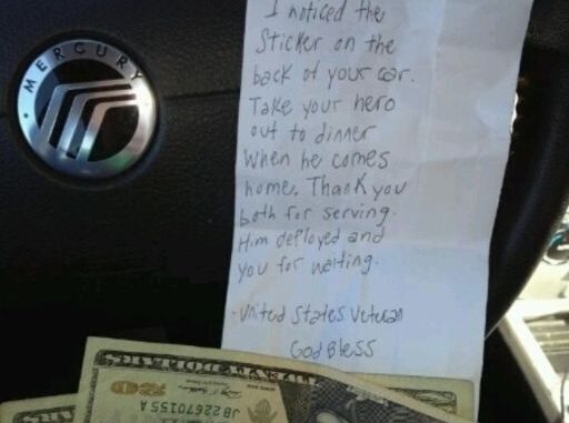 “I noticed the sticker on the back of your car. Take your hero out to dinner when he comes home. Thank you both for serving. Him deployed and you for waiting.