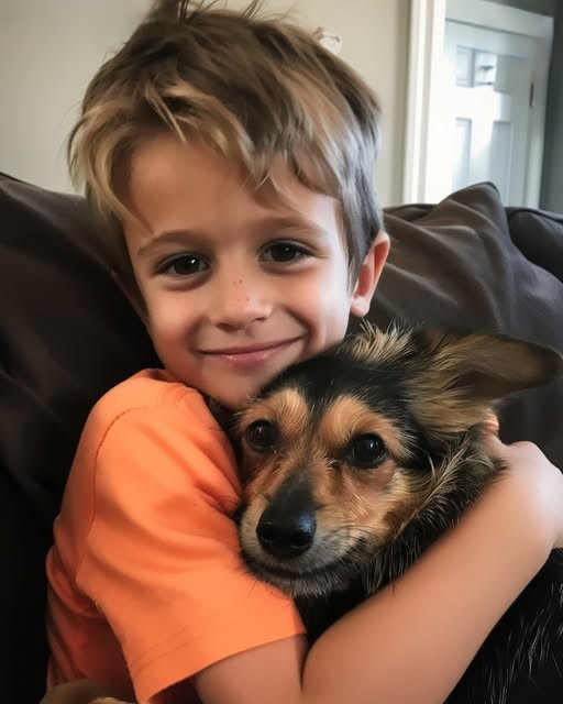 I turned around. There he was. Standing at the top of the stairs, his eyes wide and shiny with tears. And behind him… Daisy, tail wagging softly, like she didn’t realize she was about to be taken away.