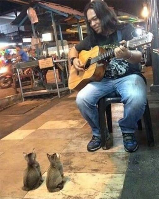 A man with shoulder-length hair sitting on a plastic chair, strumming like it was second nature. In front of him, two tiny kittens sat side by side, completely still, like they were his most loyal fans. No leash, no box—just sitting there, ears perked, eyes fixed on him like he was Springsteen and this was Madison Square Garden.