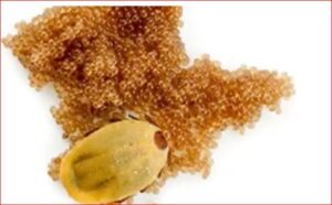 Tick eggs are tiny, typically measuring about 0.5 mm in diameter – the size of a poppy seed. They are usually oval or pear-shaped with a translucent or slightly whitish appearance, though this can vary slightly depending on the tick species. Tick eggs are often laid in clusters and attached to vegetation, leaf litter, or other surfaces near the ground. As they mature, they may become more opaque and take on a color closer to the adult tick of the species. The eggs are typically smooth and glossy in texture, and their color can range from pale yellow to light brown.