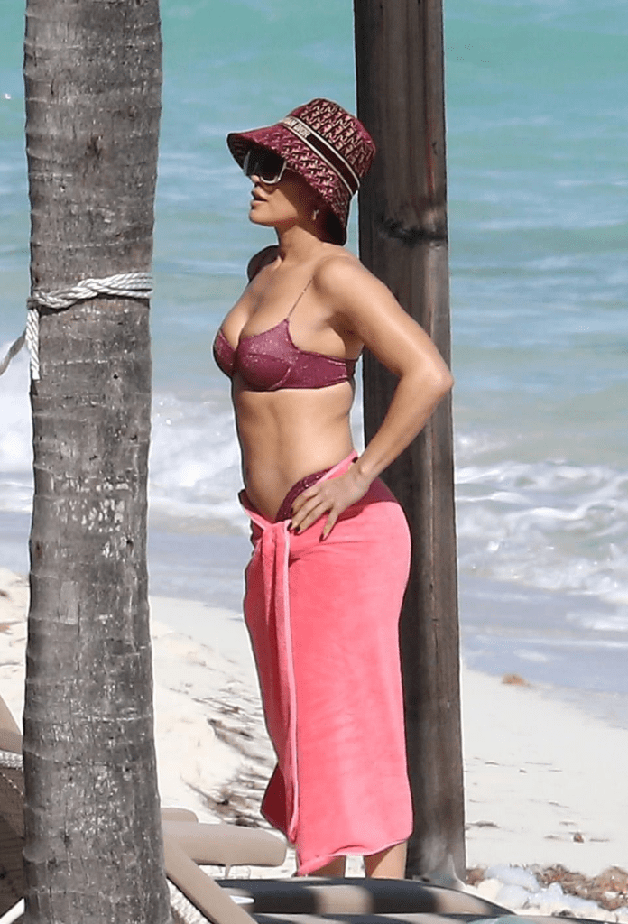To complete her flawless beach ensemble, she paired her bikini with a designer bucket hat in the same rich purple shade—a stylish and practical touch to shield her iconic locks from the sun.