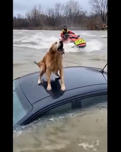 The vehicle was barely visible above the waterline, rocked violently by the rushing flood. The dog’s paws slid on the wet metal as it struggled to keep balance. Its eyes scanned the endless water surrounding it—no land, no people, nowhere to run. The car roof was the only place left above water, and even that refuge was disappearing by the second.