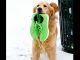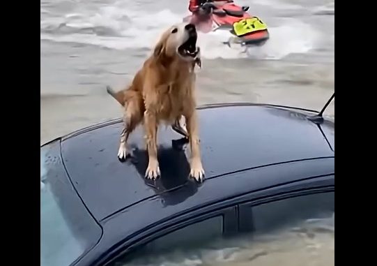 A Golden Retriever stood frozen on the roof of a nearly submerged car.