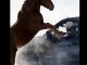 With careful balance, the rescuer reached the car roof and gently secured the dog. The Golden Retriever hesitated for a brief moment, then allowed itself to be lifted—trusting the stranger completely. In one smooth motion, the rescuer pulled the dog onto the jet ski and turned toward safety.