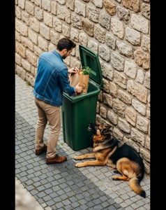 On a quiet city street, a German Shepherd notices something unusual: his owner places a full bag of groceries on top of a trash bin and walks away.