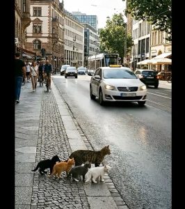 It was an ordinary day on a busy road, cars passing by one after another, engines humming without pause. For drivers, it was just another routine moment. But for a small family of cats standing frozen at the edge of the street, it was a life-or-death situation.