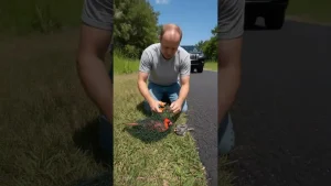 While driving down a quiet road, a man noticed a flash of bright red struggling in the grass. Upon closer inspection, he found a beautiful mother cardinal hopelessly entangled in a piece of discarded green netting, her frantic movements only making the trap tighter.