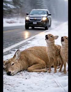By her side, two tiny fawns stayed tightly pressed against her, trembling with fear. Their soft cries were a silent plea for someone… anyone… to help.