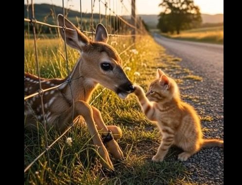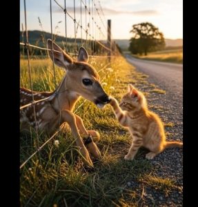 On a quiet rural road, where cars rarely pass and nature rules the day, a tiny kitten noticed something no human could see. A baby deer — scared and stuck in a tight wire fence — struggled to breathe as it tried to free its delicate legs.