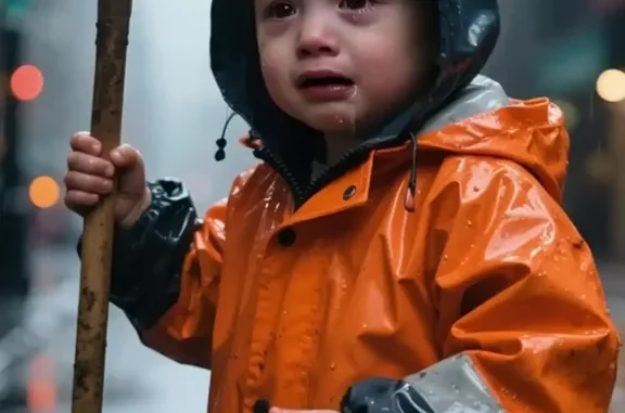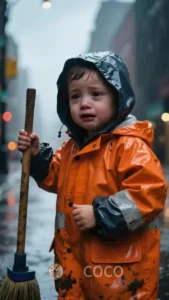 In the middle of a rainy city street, a little boy in a muddy orange raincoat was seen holding a broom, helping his mother clean the sidewalks. But what caught the world’s attention wasn’t just his kindness – it was his voice.