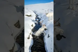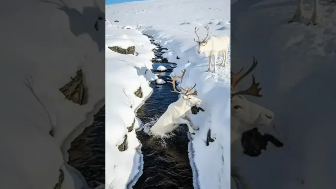 In the quiet of a vast, snow-covered wilderness, two magnificent albino reindeer were navigating the challenging terrain. The landscape was beautiful but treacherous, crisscrossed by icy streams. During an attempt to cross, one of the reindeer misjudged its leap and suddenly plunged into the dark, freezing water below.