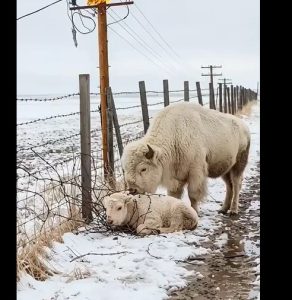 A young bison calf was trapped in a metal fence, its leg tangled and unable to move. The calf struggled helplessly, exhausted and frightened, while the cold snow continued to fall. The mother bison stayed close, clearly distressed but refusing to leave her baby.