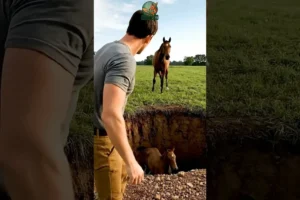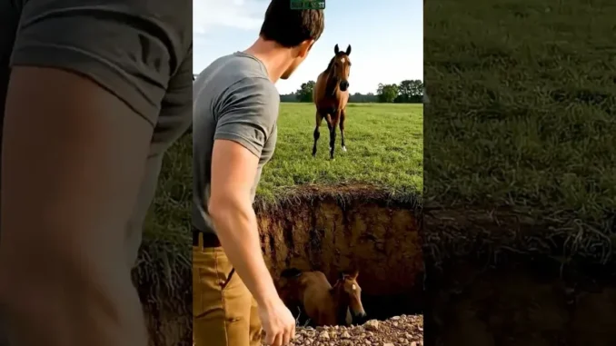 The trapped horse was visibly distressed, its body confined by the narrow space. But the most heart-wrenching part of the scene was just a few feet away. Standing at the edge of the ditch was another horse, its loyal companion, who refused to leave its friend’s side, watching with anxious and worried eyes.
