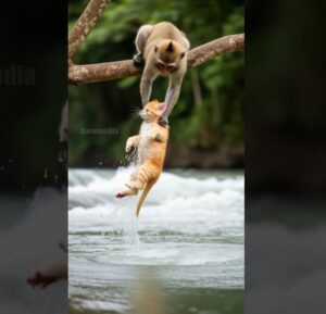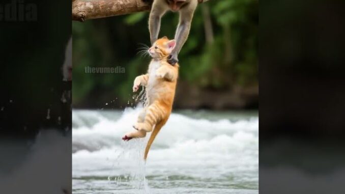In a quiet corner of the forest, by a small riverbank, something incredible happened a scene that melted hearts all around the world. A tiny kitten had accidentally fallen into the water, struggling to stay afloat. Its weak cries for help echoed through the trees. Out of nowhere, a monkey appeared curious at first, but then suddenly realizing the danger the little creature was in.