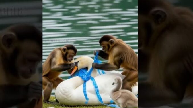 Nature is full of surprises, but sometimes, the most extraordinary moments come when animals show compassion not only for their own kind but for others too. In a quiet riverside village, people witnessed something they would never forget: a group of monkeys working together to rescue a swan trapped in plastic waste.