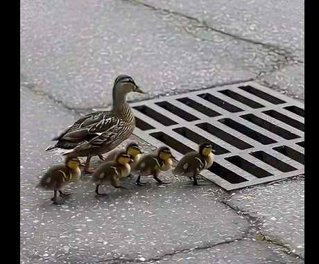 On a quiet street near a small park, a mother duck waddled nervously, quacking loudly and repeatedly. Her tiny ducklings were trapped in a drain, unable to climb out. Water ran swiftly through the narrow pipes, making it impossible for the little ones to escape. The mother duck flapped her wings in panic, her calls echoing through the area.