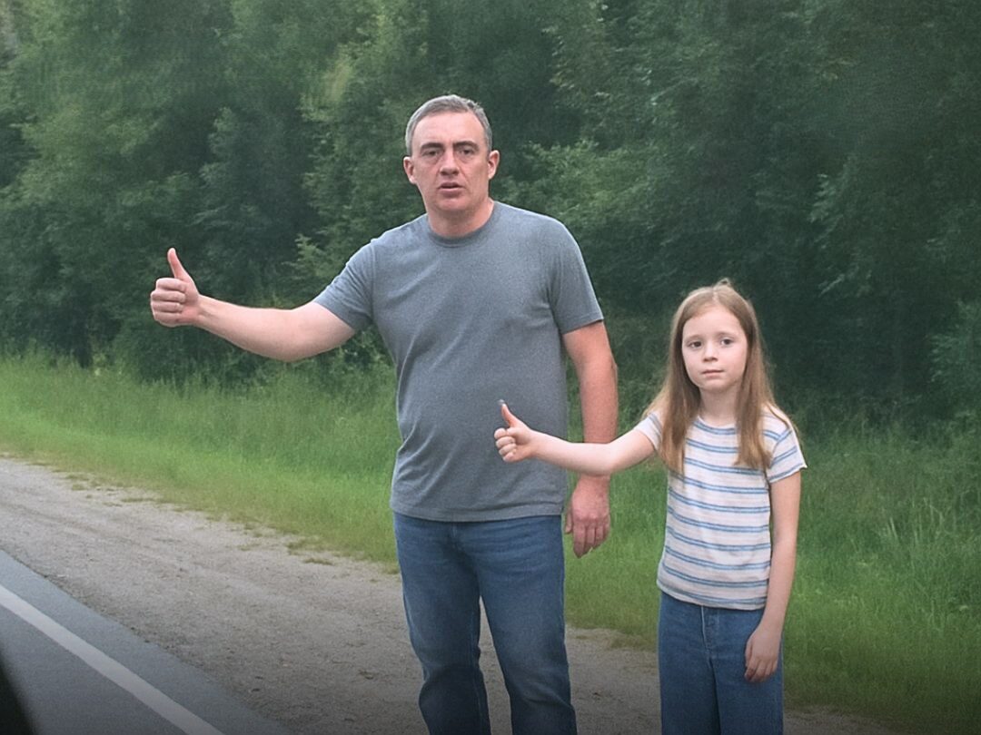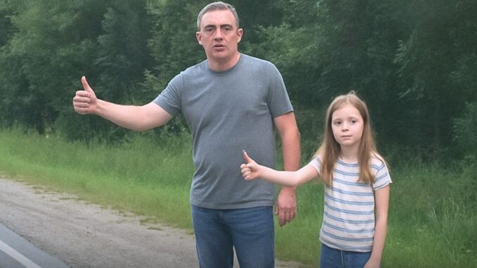 I was driving home from work, yawning, the radio humming in the background. The sun was setting behind the hills, splashing the sky with watercolor pinks and oranges. Up ahead, I saw a man and a little girl on the shoulder of the road, hitchhiking.