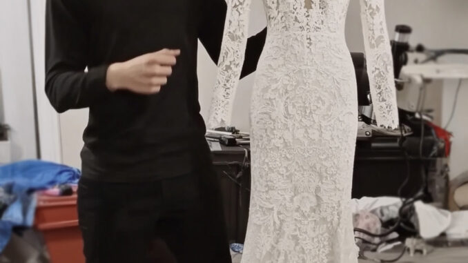 What followed were months of Adrian pouring his soul into that dress with 43 different sketches, countless fabric swatches that spread across our dining table, and late nights where I’d find him hunched over his machine, determined to get every detail perfect.