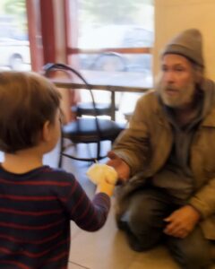 We’d just stopped in for a quick bite after preschool. He picked out a banana muffin, I grabbed coffee I didn’t need. The café was mostly empty except for the man in the corner—hood up, coat torn, eyes somewhere far away.