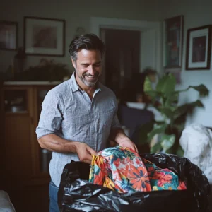 A happy man stuffing clothes into a bag | Source: Midjourney