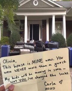 “This house is mine now. You were never more than a guest. I’ve changed the locks. My kids will be moving in. Not you. Time to grow up and move on. —Carla.”