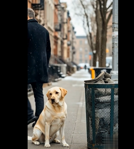 Snow fell gently onto a quiet winter street, muffling the sounds of the city. The air was cold, sharp, and still. In the middle of it all, a Labrador Retriever walked slowly through the snow, an old coat hanging from its mouth.