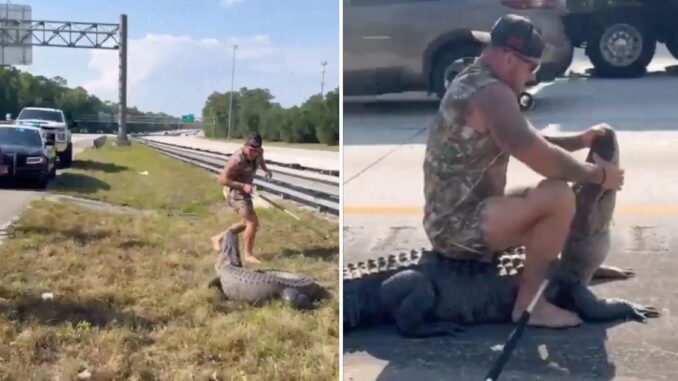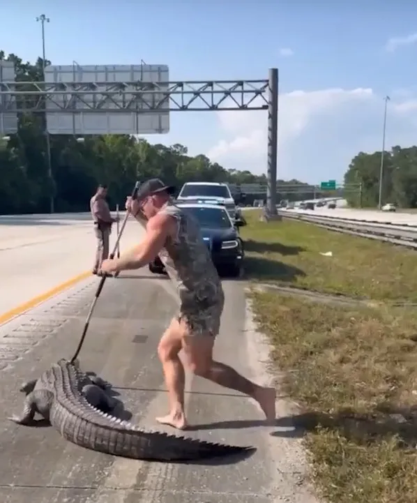 Known online as the “Blue Collar Brawler,” Dragich was caught on camera last week fearlessly subduing a 6-foot gator on I-95 near Jacksonville. Clad in nothing but a camouflage muscle tee and shorts, the ex-Marine calmly maneuvered the massive reptile using a pole before leaping on its back and tying its powerful jaws shut — barefoot.