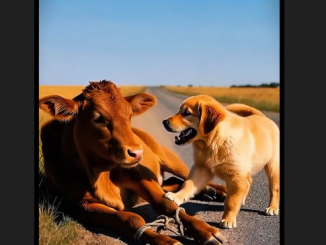 On a quiet roadside bordered by grass and asphalt, a small puppy noticed something unusual. Just a few steps away, a young calf lay trapped, […]