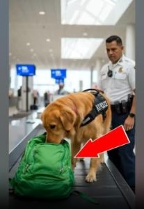 In the middle of a busy terminal, with passengers rushing and bags rolling across the conveyor belt, a golden retriever K9 stood locked in full professional mode. Wearing his police vest and focused expression, he zeroed in on a bright green backpack that had just passed through the scanner.