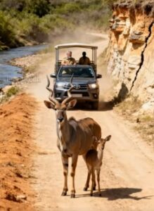 No one on the safari vehicle understood what was happening at first. The sun was shining over the dry African landscape, birds were calling from the cliffs above, and the group of tourists believed they were experiencing another quiet moment of wildlife observation. But everything changed when a massive eland bull stepped onto the dirt road, standing firmly in their path with its young calf beside it. What looked like an act of aggression soon revealed itself as one of nature’s most astonishing displays of instinct and protection.