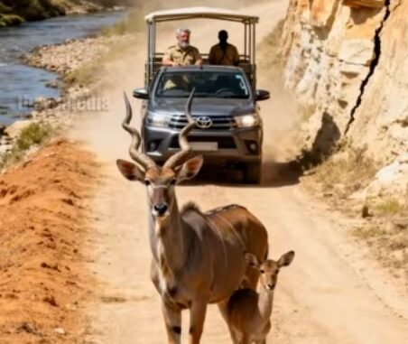 No one on the safari vehicle understood what was happening at first. The sun was shining over the dry African landscape, birds were calling from the cliffs above, and the group of tourists believed they were experiencing another quiet moment of wildlife observation. But everything changed when a massive eland bull stepped onto the dirt road, standing firmly in their path with its young calf beside it. What looked like an act of aggression soon revealed itself as one of nature’s most astonishing displays of instinct and protection.