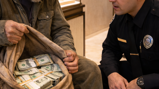 The elderly man reached into the sack and handed a stack of money to the guard.