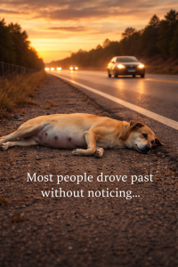She stepped out and walked carefully toward the dog lying on the hot roadside gravel. Up close, the reality hit harder. The dog was heavily pregnant. Breathing unevenly. Barely able to lift her head.