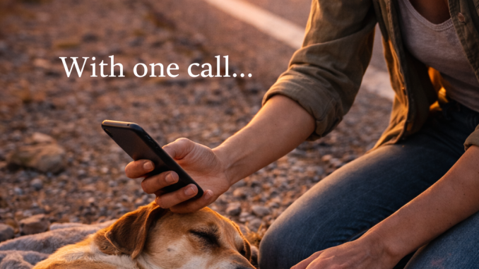 With one hand gently resting on the dog’s trembling body, she pulled out her phone with the other. Her fingers shook slightly as she made the call.