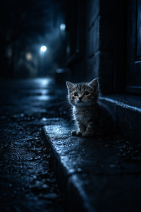 It was a dark, empty street. Cold wind moved through the silence. On a small doorstep, a tiny kitten sat alone.