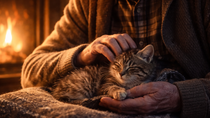 Later, inside a small cozy home, the kitten slept peacefully in his lap near a quiet fireplace. The world outside still cold. Inside, warmth.