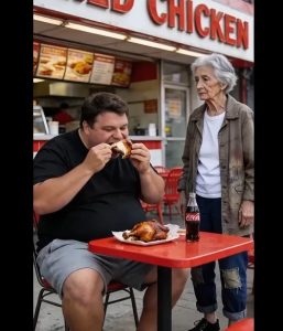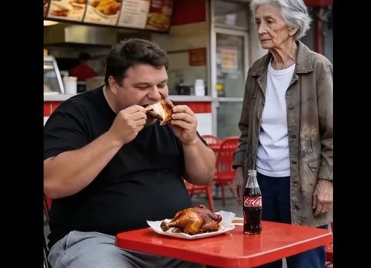 On street , an elderly woman named Jenny moved slowly from table to table, quietly asking for food. Her clothes were worn, her hands trembling, her eyes tired from years of hardship. Most people avoided her gaze. Some shook their heads. Others pretended not to see her at all.