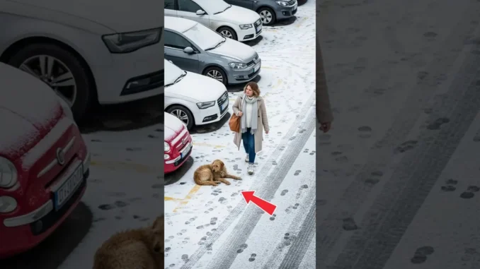 On a cold, snowy day, a woman walking through a parking lot encountered a golden retriever lying stubbornly on the ground. Annoyed and in a hurry, she perceived the dog as an obstacle and tried to urge it to move along, clearly frustrated by its presence.