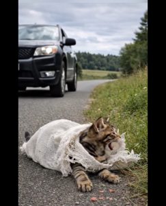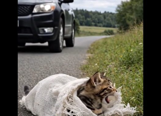 On the side of a busy road, a small cat lay helpless — trapped inside a piece of cloth, unable to move or escape.
