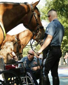 The mounted officers had stopped for just a moment, letting people admire the horses. Kids giggled, parents snapped photos, and life buzzed around them. The sun hung low in the sky, casting golden light over the small park where they’d paused during their patrol. It was one of those rare moments when duty felt less like work and more like connection.