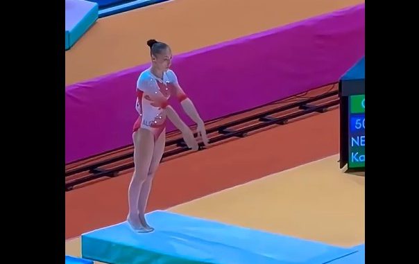 She inhaled, removed her jacket, and walked toward the beam with calm focus. The crowd quieted. Her opening pose drew applause. Her leaps and turns were precise, fluid, controlled. And then came the acrobatic series—the riskiest part of her routine.