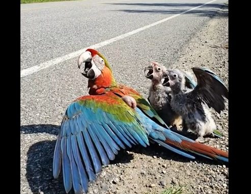 An injured mother parrot lay exhausted on the ground, one wing stretched out and unable to move.
