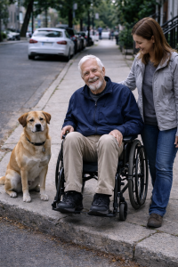 The dog walked straight to the man and sat beside him, pressing its body gently against the wheelchair. The man sighed — tired, patient, and grateful all at once.