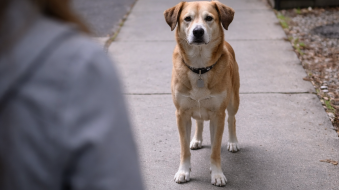 The dog sat near the sidewalk, its ears alert, eyes moving between passing strangers as if it were waiting for something — or someone. When she slowed down, the dog locked eyes with her.